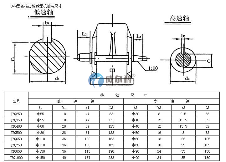 JZQ齒輪減速機應用范圍及結構概況 1、應用范圍及優(yōu)點: 本機廣泛應用于各種起重、運輸、礦山機械及其它各種機械中作減速之用。其聯(lián)動方式,可用聯(lián)軸器直接聯(lián)動,也可用三角皮帶撓性聯(lián)動。 本機通用性和互換性強,維修簡單,效率系數(shù)為0.94,具有起動阻力小,運動靈活等優(yōu)點。 2、結構概況及主要零部件: 本機結構型式為兩級三軸圓柱斜齒水平分割全封式。潤滑油盛于減速機之內部,在主動軸和中間軸上設有擋油板,各軸支點均用滾動軸承,其軸向間隙,可用內部調整環(huán)調整之,本機上部有一檢查蓋,下部有油標指針和排廢油用的油塞。
